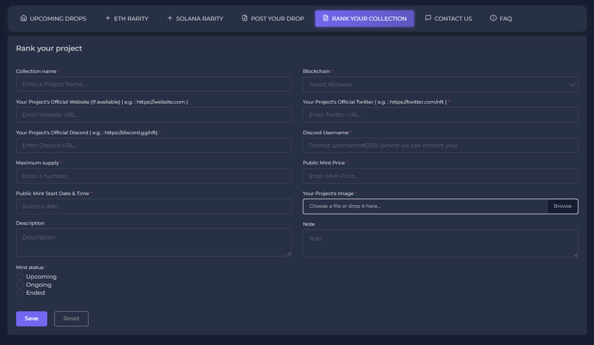 Up until this point, we only offer ranking for collections minted on **Solana** and **Ethereum** networks. If the mint status of your collection is still "upcoming" or "ongoing", you will have to be patient and wait for it to end so we can rank it for you.